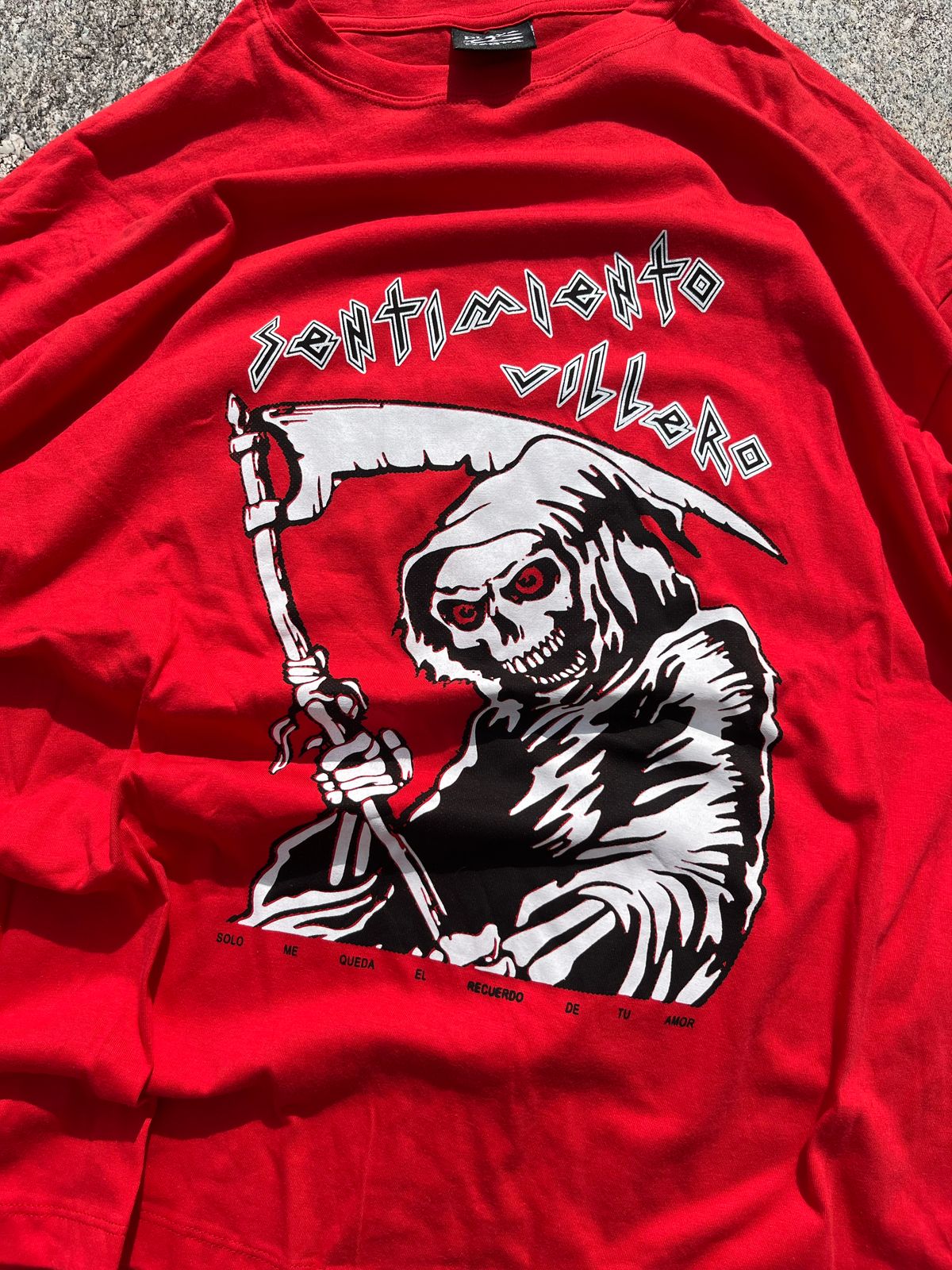 remera «sentimiento villero» en rojo con frase «solo me queda el recuerdo de tu amor»